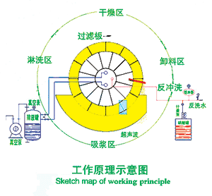 吸漿區(qū):工作時浸沒在料漿的過濾板在毛細(xì)作用下結(jié)合真空壓力,表面吸附成一層濾餅,濾液通過濾板進(jìn)分配閥至排液罐。